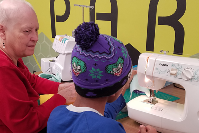 Why does Janet volunteer at the library? She chose to volunteer with the library because she enjoys sewing, sharing her knowledge, and working with youth. She stated, “When I learned about this opportunity, I was excited to squeeze it into my schedule.” She says it best: “Every time I volunteer at the library I leave bubbly, exhilarated, and excited. Helping people learn a skill fills me with a wonderful, euphoric feeling. I love to see the look of accomplishment and pride on the students faces. They have been a fantastic group to work with.”