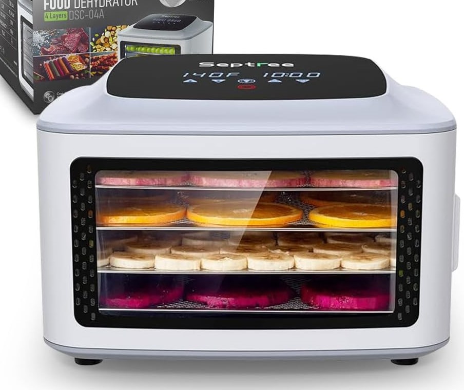 Try it, before you buy it! This food dehydrator holds 4 drying trays, perfect for drying small batches of food. It also comes with a recipe book.